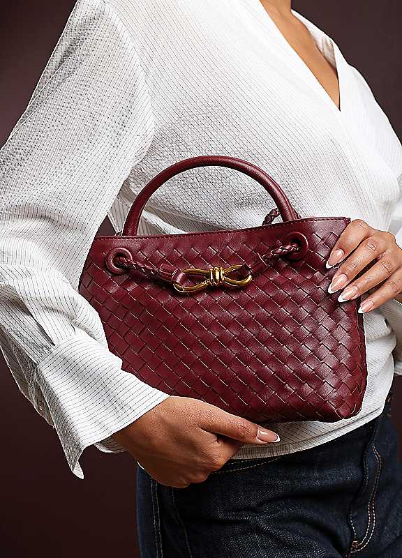 Make a bold statement with this Luna Woven Leather Tote bag with Gold Detail, blending timeless craftsmanship with modern elegance. The rich texture and intricate weave elevate its luxurious appeal, while the gold-tone hardware adds a refined finishing touch. Perfect for evening outings or stylish daywear, it offers both form and function in a sophisticated silhouette. Its structured form ensures it keeps shape while exuding high-end charm.Brush the bag with a brush to remove dust, debris, and light scuffs. Remove water stains by dampening with water.Faux LeatherDimensions approx. 25L x 19H x 10W
