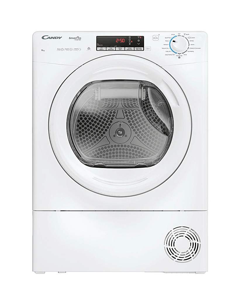 Candy 9kg Load Capacity Heat Pump dryer, this technology provides extremely high energy efficiency as well as excellent drying performance. With an A+++ energy rating, it heats the air utilising refrigerant instead of electricity, which means that it consumes significantly less power than conventional condenser tumble dryers and ensures no energy is wasted. Featuring clever Sensor Dry technology allows you to set the level of dryness you require, and the dryer then switches off automatically when this level of dryness has been reached. Choose from Extra Dry, Store Dry, Hang Dry and Iron Dry. It also comes with 14 Programs, including a Wool Program and a few Rapid Programs that are ideal for smaller loads. With Wi-Fi connectivity, you can download additional programs, operate remotely, get clever energy look-ups, and it even helps with diagnostics. It comes with Aquavision, a unique, patented water reservoir built right into the tumble dryers door. The ergonomically designed Aquavision makes it easy to see when the water needs emptying and has a convenient handle, making it easy to remove for emptying and carry in the same way as a small bag. The tumble dryer benefits from having an extra-large porthole, making it easy to load and empty, reducing the stress on your body. Sensor Dry, Heat Pump Technology, 8kg Capacity, Wi-Fi Connected, Start Delay, Wool Program, Rapid Programs, Large Porthole, Aquavision water collection in the door.