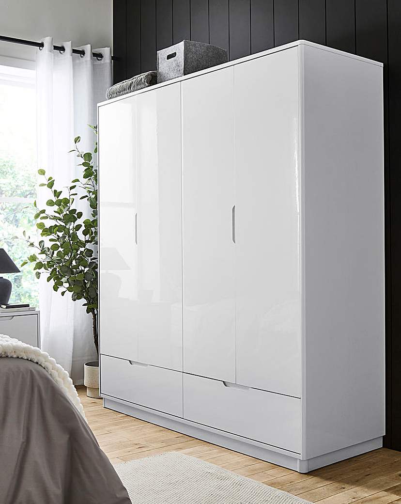 Ellia 4 Door Wardrobe. 4 cupboards, 2 drawers at the bottom, finished in a White colour