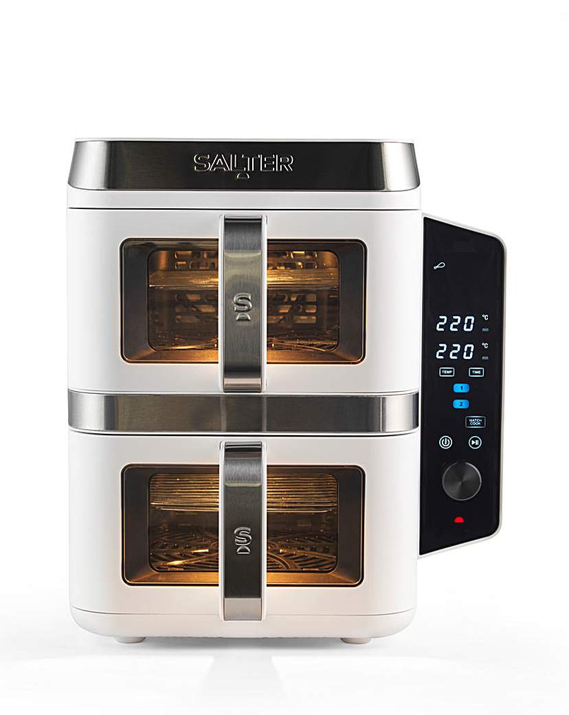Level up your cooking with the Salter VertiCook View Air Fryer! With a vertical design, enjoy a generous 9L capacity split into two dishwasher-safe and PFAS-free 4.5L baskets, allowing you to cook across four levels. A stainless-steel grill is included, and you can choose from 12 preset cooking functions, including Sync & Match. Measuring L32cm x D42cm x H38cm approx, this air fryer is 30% slimmer (vs Ek4548 excluding control panel), so you can neatly store on your countertop and under cabinets of 38cm. Each PFAS-free non-stick drawer is dishwasher safe and includes a stainless-steel rack so you can cook double the ingredients. Our top tip for extra-crispy results? Add your protein to the top of the rack and your sides below. Take the guesswork out of cooking with a simple touch! Choose from 12 cooking presets there is even a keep warm function too! Sync & Match are available across the 2 drawers to match time, temperature and serve at the same time! Choose your setting from the digital LED touchscreen display with control dial. You can adjust the temperature from 60-220C. Both cooking baskets have an easy-view window to keep an eye on your food without having to open the drawers! Did you know? Using an air fryer instead of a traditional oven can save you 50% on your energy bills. (Comparing the energy used (kWh) per kg of chicken using a 1.8 kW electric oven). 1 x White VertiCook View Air Fryer, 2 x Grill Rack