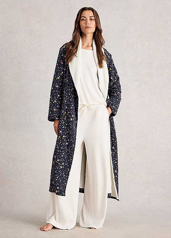 A super cosy dressing gown with a fluffy lining and patch pockets. Rushing around is virtually impossible. Machine washable Outer: 95% Organic Cotton, 5% Elastane Lining: 100% Polyester Keep away from fire.