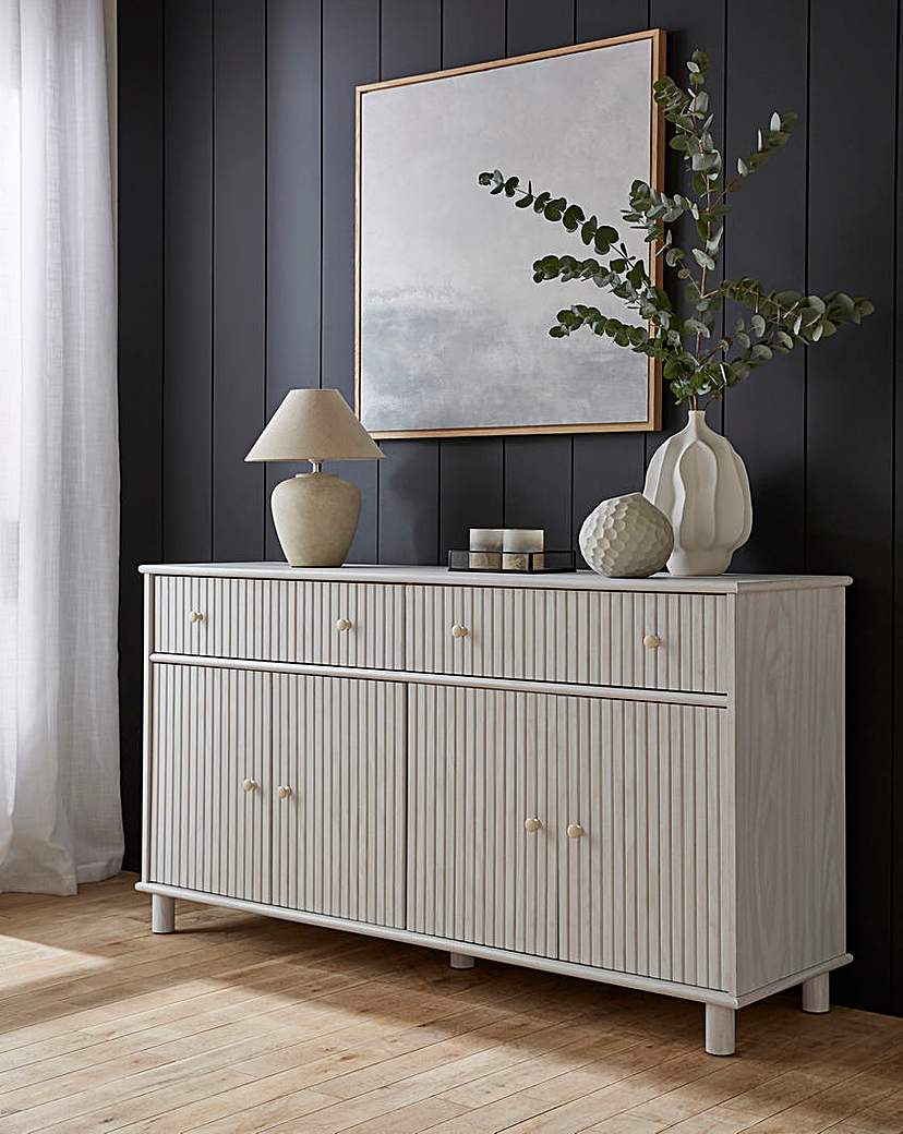Latimer 4 Door Sideboard. 2 drawers at the top, 4 cupboards at the bottom, ribbed effect, finished in a White Wash colour.