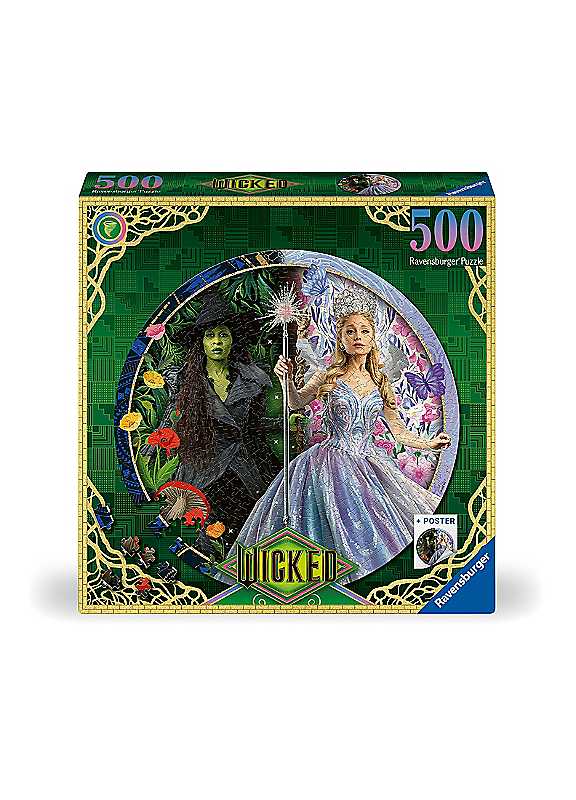 A magical 500 piece round jigsaw puzzle featuring iconic designs and characters from the Wicked movie Part 2.Ravensburger's 500 piece jigsaws are crafted with premium quality materials and measure 52cm in diameter when complete. Great for Adults and ideal puzzles for Children 10 years old and up. Fully complies with all necessary UK and EU testing standards.Best selling puzzle brand worldwide - With over 1 billion puzzles sold, our jigsaw puzzles make ideal gifts for women, great gifts for men and fit perfectly on our puzzle board. Our puzzles use an exclusive, extra-thick cardboard combined with our fine, linen structured paper to create a glare-free puzzle image and give you the best experience possible.Positively Puzzling - From fun family times together to long term health benefits and day-to-day mindful moments, there are so many positives about the humble Jigsaw! They make a great birthday gift or smashing Christmas gift.Age suitability: 10 yearsNot suitable for children under 3 years old.