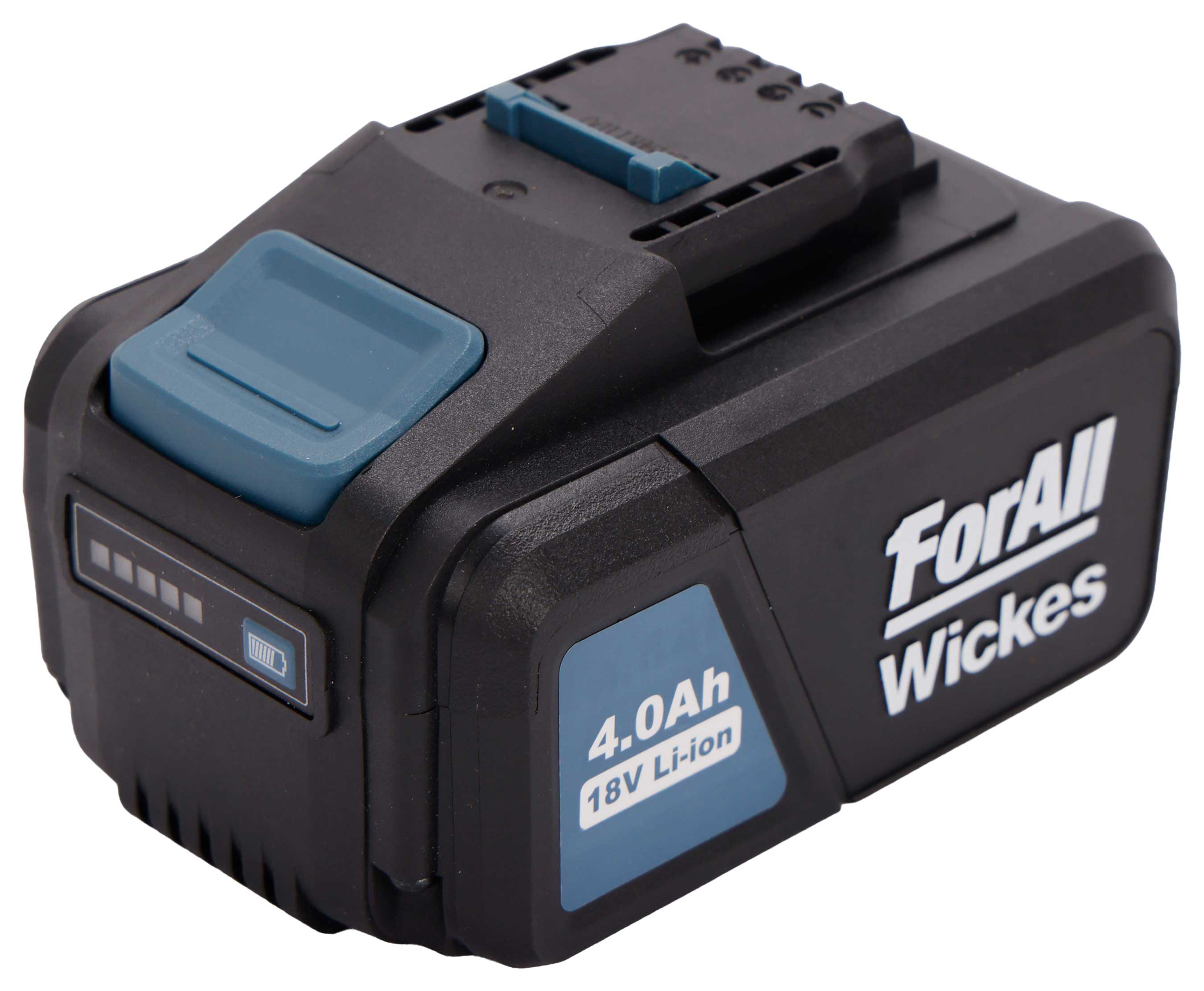 Wickes 18V 4.0Ah Li-ion 1ForAll Battery - Wickes 18V 4.0Ah Li-ion battery is compatible and interchangeable with all Wickes 1ForAll Cordless products. The high-quality lithium-ion cells are resistant to the self-discharging previously associated with rechargeable batteries.