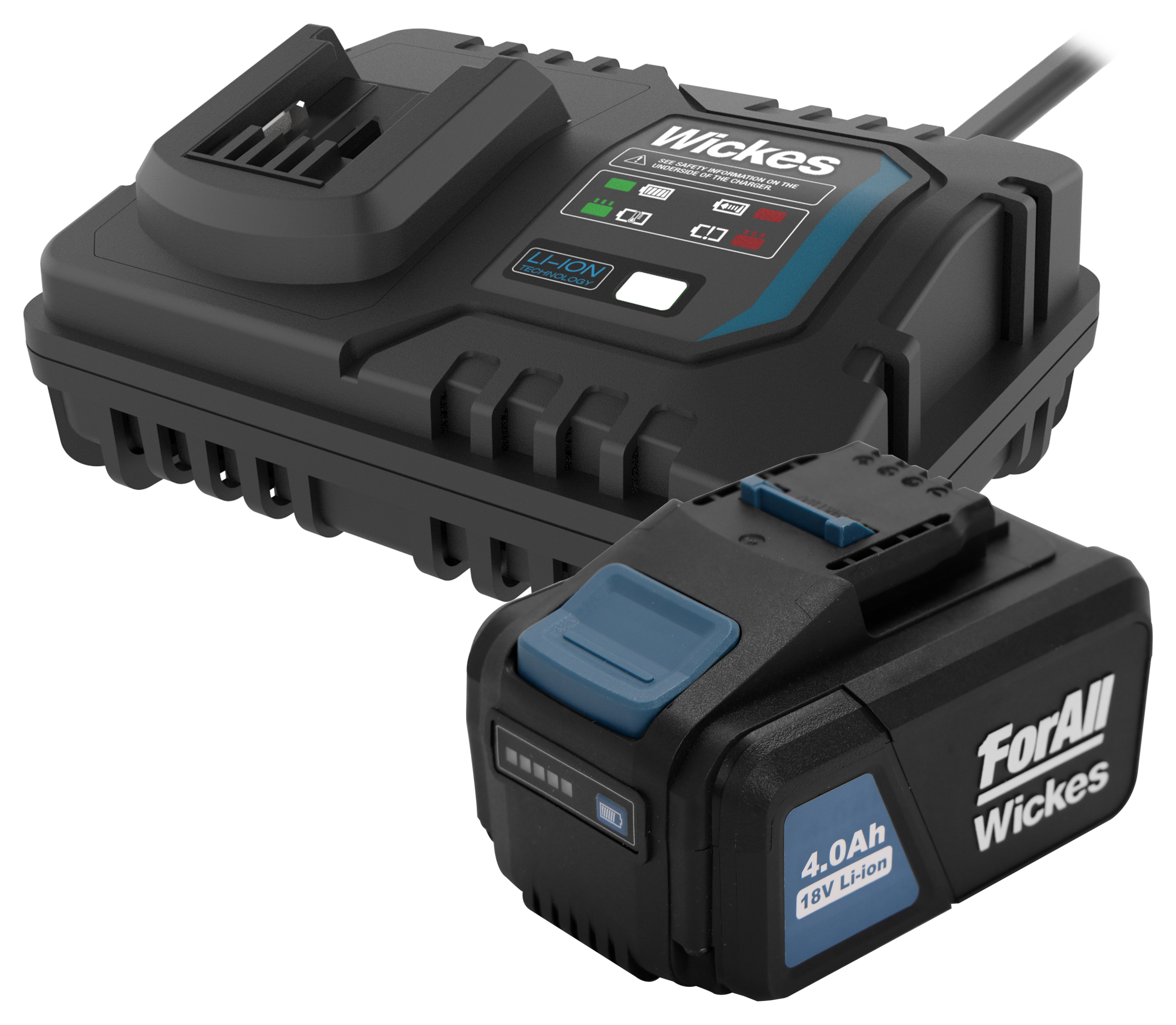Wickes 18V 4.0Ah Li-ion Battery & Charger Kit - Wickes 18V 4.0Ah Li-ion battery and charger kit is compatible and interchangeable with all Wickes 1ForAll Cordless products. The high-quality lithium-ion cells are resistant to the self-discharging previously associated with rechargeable batteries.