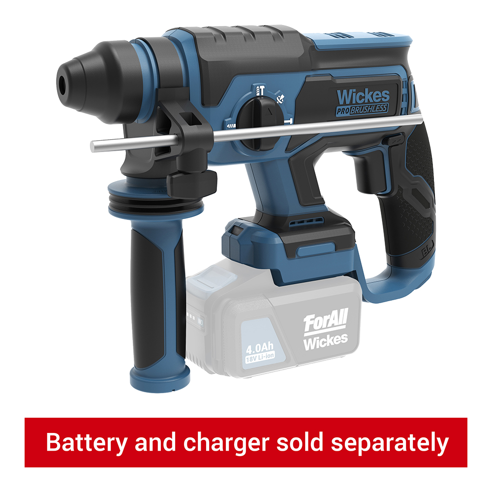 Wickes 18V Cordless Brushless SDS+ Rotary Hammer Drill 22mm - Bare - The Wickes Cordless Brushless Hammer Bare with brushless motor technology, gives you extra power, torque and runtime. Suitable for drilling, hammer drilling and chiselling. Part of the Wickes 1ForAllĀ® Battery system where the batteries and chargers are interchangeable and compatible with all Wickes 1ForAllĀ® Cordless Power Tools and Garden Power Tools. Supplied without batteries or charger, sold seperately.