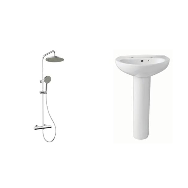 Wickes Alure Round Thermostatic Mixer Shower Chrome + Wickes Portland 2 Tap Hole Ceramic Bathroom Basin with Full Pedestal 550mm