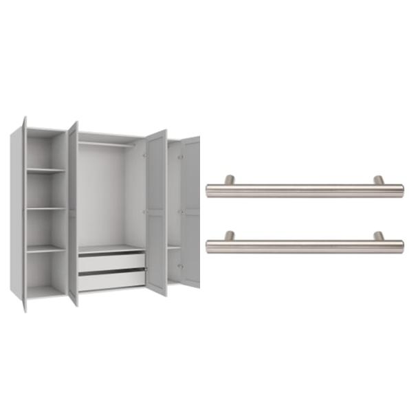 Wickes Ashland Grey Shaker 3 Cabinet Quad Wardrobe with Shelves Drawers 1800 x 2000mm Our Ashland Shaker Quad Wardrobe is all you need to create a 1 8m wardrobe with a rail shelves and drawers Designed with four doors in a contemporary grey matt finish this wardrobe includes a hanging rail two soft close drawers and six shelves offering additional storage for your clothes and accessories Please note handle holes are not pre drilled to allow for choice of style open height and handle length Handles sold separately