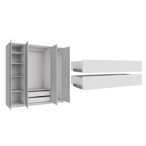 Wickes Ashland Grey Shaker 3 Cabinet Quad Wardrobe with Shelves Drawers Plinth Panels 2083 x 2036mm Our Ashland Shaker Quad Wardrobe with Plinth Panels is all you need to create a seamless 2 1m wardrobe with a rail shelves and drawers Featuring four doors in a contemporary grey matt finish a colour matched plinth and end panels Cabinet and interior are easy to assemble please note both the plinth and end panel need to be cut to size Wardrobe includes a hanging rail two soft close drawers and six shelves offering additional storage for your clothes and accessories Please note handle holes are not pre drilled to allow for choice of style open height and handle length Handles sold separately