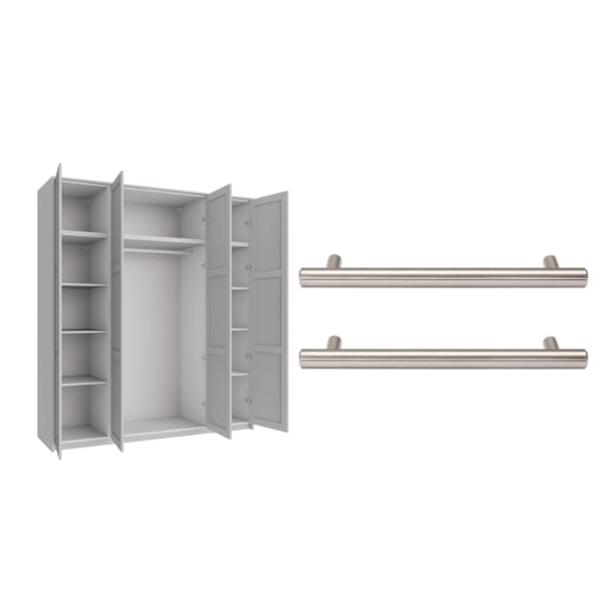 Wickes Ashland Grey Shaker 6 Cabinet Quad Wardrobe with Rail Shelves Plinth Panels 2333 x 2036mm Our Ashland Shaker Quad Wardrobe with Plinth Panels is all you need to create a seamless 2 33m wardrobe with a rail and shelves Consists of 1 8m and 0 45m cabinets to allow for easier assembly and lower ceiling height requirements to stand up Featuring four doors in a contemporary grey matt finish a colour matched plinth and end panels Cabinet and interior are easy to assemble please note both the plinth and end panel need to be cut to size Wardrobe includes a hanging rail and six shelves offering additional storage for your clothes and accessories Please note handle holes are not pre drilled to allow for choice of style open height and handle length Handles sold separately