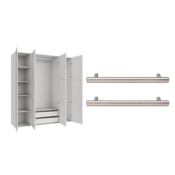 Wickes Ashland White Shaker 3 Cabinet Quad Wardrobe with Shelves Drawers 2250 x 2000mm Our Ashland Shaker Quad Wardrobe is all you need to create a 2 25m wardrobe with a rail shelves and drawers Designed with four doors in a classic matt white finish this wardrobe includes a hanging rail two soft close drawers and six shelves offering additional storage for your clothes and accessories Please note handle holes are not pre drilled to allow for choice of style open height and handle length Handles sold separately