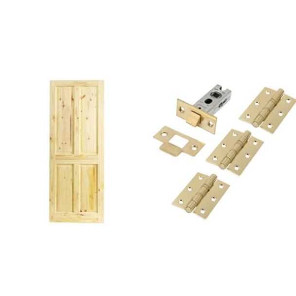 Wickes Chester 4 Panel Knotty Pine Fire Door 1981 x 686mm + Wickes Heavy Duty Hinge Latch Pack Polished Brass