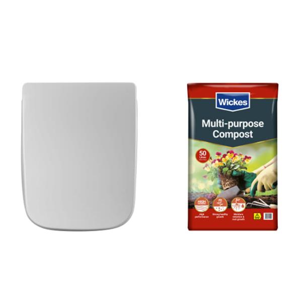 Wickes Soft Square Thermoset Plastic Soft Close Quick Release Toilet Seat White + Wickes Peat Free Multi Purpose Compost 50L