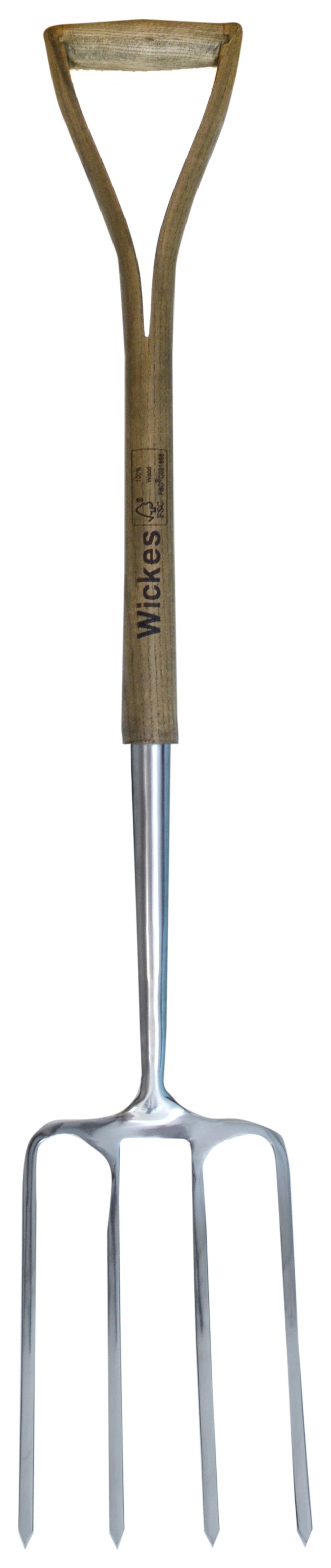 Wickes Stainless Steel Wooden Handle Digging Fork - The Wickes traditional-style Stainless Steel Digging Fork is a durable and versatile tool, ideal for digging, turning, and aerating soil in flower beds and garden borders. Its mirror-polished stainless steel head resists rust and minimises soil adhesion, while the hardwood shaft with a wishbone handle provides comfort and durability. Ideal for loosening soil, lifting plants, and clearing debris, this fork is also excellent for harvesting bulbs and root vegetables. Whether you’re tackling large garden areas or general gardening tasks, it’s the perfect companion for a thriving garden.