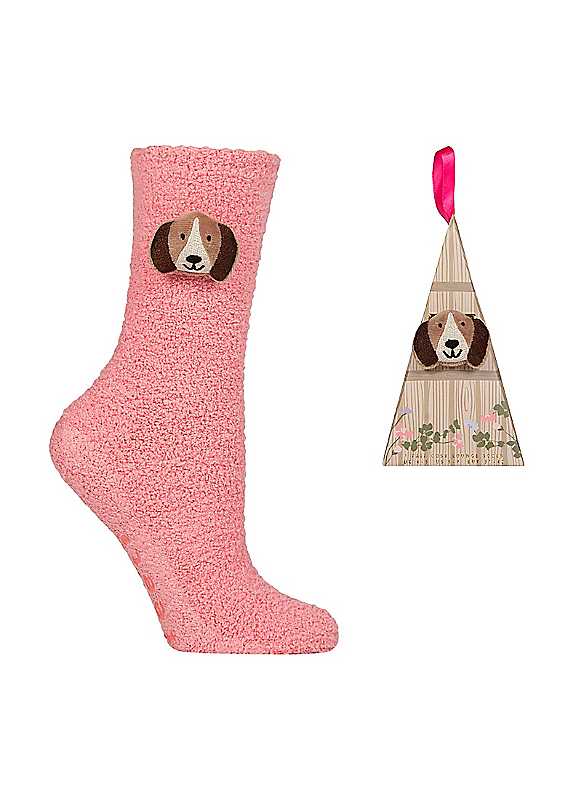 Wild Feet Ladies Fluffy Dog Socks in 3D Hanging Gift Box - Pink/Brown