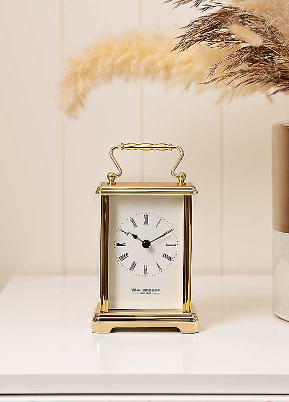 The Wm. Widdop Gold Carriage Clock brings timeless elegance to any room, featuring a polished gold-tone finish, classic Roman numeral dial and traditional carriage handle detail. It's refined, traditional design makes it a standout piece for mantelpieces, shelves or desks, adding a touch of sophistication to both modern and classic interiors. A beautifully crafted choice for gifting or enhancing your home d©cor with a sense of heritage and style. This clock requires one AA battery (not included).Metal AlloyDimensions approx. 16H x 9W x 6D cm | roman numerals clock