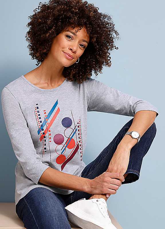 Cotton Graphic Print Top is the perfect addition to any woman's casual wardrobe. With its eye-catching graphic print, round neck, and three-quarter sleeves, this top is both stylish and comfortable. The three quarter length sleeve and round neckline provide a flattering fit for all body types. Whether you're running errands or meeting friends for brunch, this top is versatile and can be dressed up or down. Made from high-quality cotton, this top is soft and breathable, making it perfect for day wear. Available in a range of sizes, this top is designed to flatter women of all shapes and sizes. Add a touch of graphic print to your wardrobe with Cotton Graphic Print Top.Brand: WittGraphic printRound neckThree-quarter sleevesMachine washable50% Cotton, 50% PolyesterLength approx. 66 cmPlease Note: European sizing tends to run smaller than UK. We suggest sizing up for the perfect fit!