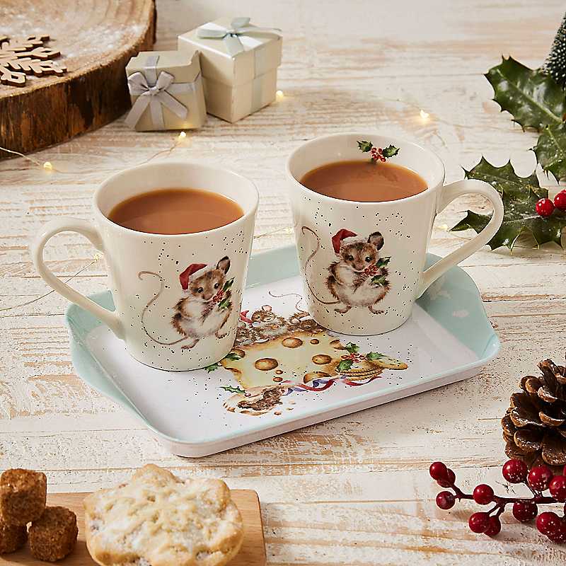 Wrendale Designs Holly Jolly Christmas Porcelain Mugs & Tray Set - Size 21x14cm