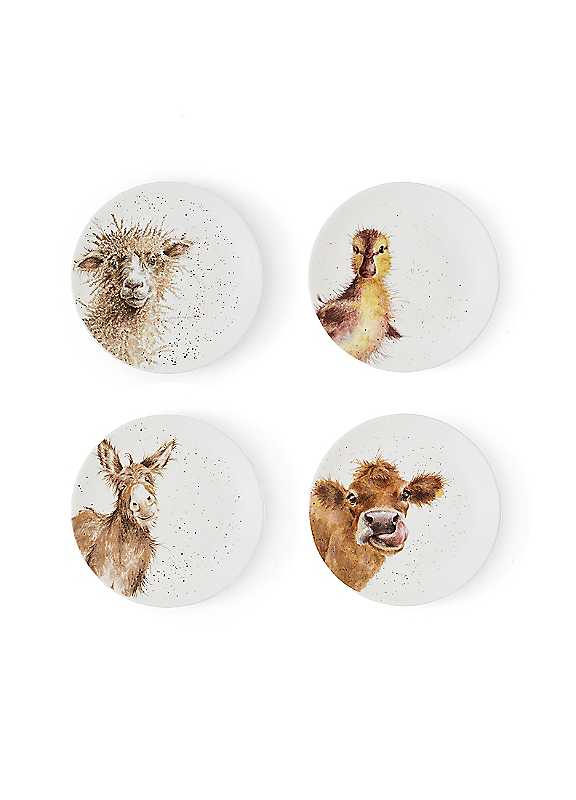 This delightful set of 4 coupe plates from Royal Worcester Wrendale Designs features adorable designs of a donkey, duckling, cow and sheep. Originally hand-painted in watercolour by Hannah Dale, these coupe plates make for an adorable table setting.Set of 4Microwave & dishwasher safeFine Bone ChinaDimensions approx. 1.3H x 16.5W x 16.5D cm