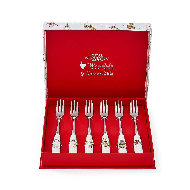 This set of 6 pastry forks from Royal Worcester Wrendale Designs is a merry addition to your festive afternoon tea setting. Featuring a selection of Christmas characters originally hand-painted by Hannah Dale on each porcelain handle, the set is presented in an adorable gift box, making it an ideal gift. Set of 6 Hand wash Porcelain & stainless steel Dimensions approx. 1 x 1.4 x 15.5 cm | christmas flatware, porcelain silverware, party cutlery set, stainless steel forks, stainless steel cutlery, cutlery set 6, designer cutlery set, stainless steel set