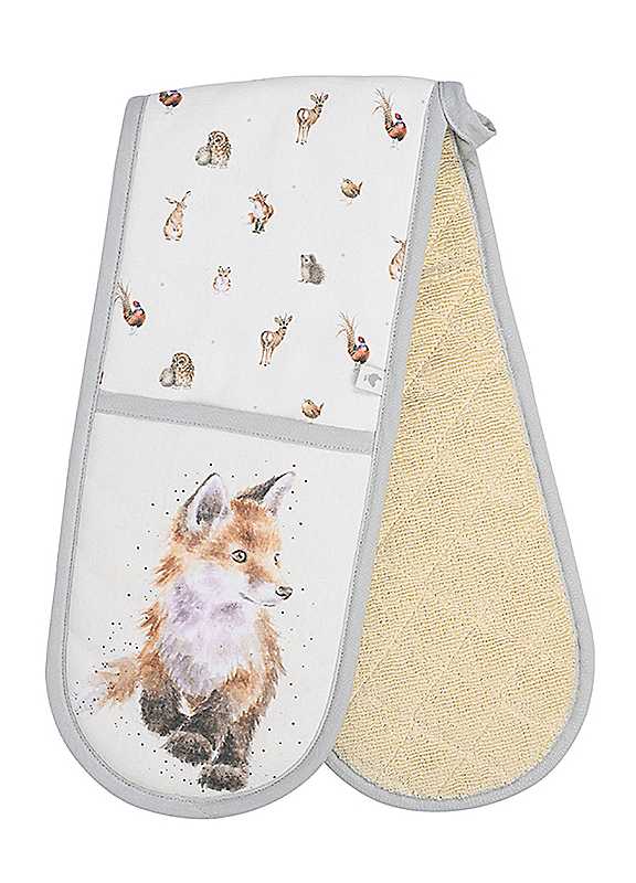 A wonderful addition to any kitchen, these fabulous oven gloves feature our 'Woodlanders' design in a repeat pattern and a large fox design on the mitts. Contrasting piped edging, a handy loop for hanging and towelling reverse mean these gloves are both stylish and practical.100% CottonSize approx. 89 x 18 cm