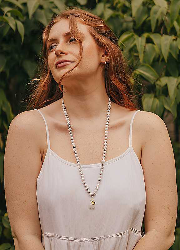Lovingly handmade by our talented, in-house jewellery makers, this gorgeous necklace is hand-wrapped and features Howlite semi-precious stone crystals with a gold-tone leaf and 14ct gold tone chain extension to finish. The longer-length necklace is the perfect statement piece to wear this season. Complete the full look with the matching bracelet. Each necklace is unique due to the natural materials and form used - we think this is lovely as it makes each necklace unique to you.Howlite jewellery promotes spirituality and enhances communication with the physical and spiritual worlds. When Howlite crystal is placed on the third eye, it's used to enhance intuition and is the perfect crystal to use during meditation. When Howlite is placed on the throat chakra and worn as a necklace, for example, it's perfect for releasing old vows, inhibitions & prohibitions. Howlite crystals allow the soul to express itself once more.This necklace will come beautifully gift-wrapped as standard, ready to gift to a loved one or to keep as a little treat for yourself.Limited edition design, handmade using natural stones.Brand: Xander KostromaHowlite Stones, Quartz Pendant, Cotton, 14ct Gold Plated Metal | boho style necklace, crystal pendant necklace, handmade long necklace, crystal statement necklace, gold pendant necklace, white stone necklace, statement pendant necklace, howlite crystal necklace, 14kt gold pendant necklace