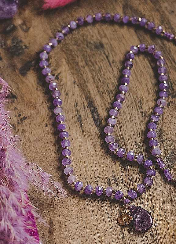 Made using Amethyst crystals on a purple cord, this necklace features a tear-shaped matching Amethyst pendant with complimentary gold tone pendant to finish. Amethyst is a natural tranquilliser it relieves stress and strain, soothes irritability, balances mood swings, and dispels anger, rage, fear and anxiety. Fall in love with this necklace by Xander Kostroma. Each piece is lovingly hand-made in limited quantities and will come beautifully gift wrapped. Each piece is ready to gift to a loved one direct or great to keep as a sweet treat for yourself.Brand: Xander KostromaAmethyst, Plated alloy metalChain measures approx. 76 cm (30¼ in) Pendant size approx. 1.6 x 2.3 cm (½ x ¾ in) | crystal pendant necklace, amethyst gold necklace, boho style necklace, amethyst stone necklace, amethyst crystal necklace, purple stone necklace, amethyst pendant necklace, long chain necklace, long pendant necklace, gold necklace pendant, beaded necklace with pendant, gold stone necklace, necklace with amethyst, purple amethyst necklace, handmade beaded necklace
