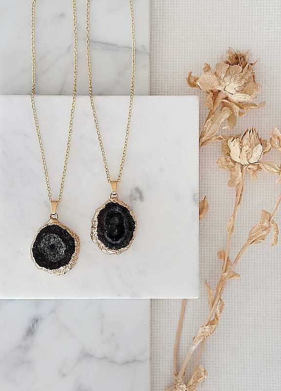 Gold Tone Long Length Mini Raw Black Agate Pendant Necklace. Handmade in small batches using fairly sourced, grade A premium crystals, this gorgeous mini crystal necklace features a black Agate pendant slice with gold-tone detailing on the outer edge on a 14 ct gold-plated, longer-length chain that measures approx. 68 cm. Each pendant necklace is completely unique due to the natural formations of the semi-precious stone used. We think this is wonderful, and it's what makes them completely special to you. Your necklace will be intuitively chosen before dispatch. Agate cleanses and stabilises the aura while eliminating and transforming negativity. Each crystal necklace by Xander Kostroma comes lovingly gift-wrapped ready to gift to a loved one or to keep as a little treat for yourself.Brand: Xander KostromaHandmade, gift-wrapped, Unique design | crystal pendant necklace, gold plated necklace, handmade pendant necklace, black pendant necklace, gold pendant necklace, agate pendant necklace