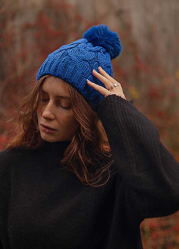 Brand new from Xander Kostroma this season, this gorgeous chunky cable knitted beanie hat is the perfect winter finishing accessory. It comes in a royal blue colour and features a turned-up hemline with a cute faux fur, pom-pom to finish. The super soft knit fabric feels lovely against the skin with just enough give to fit snuggly against the head. One size will fit most. Looks great with the matching scarf, worn as a complete set.Brand: Xander Kostroma100% Acrylic
