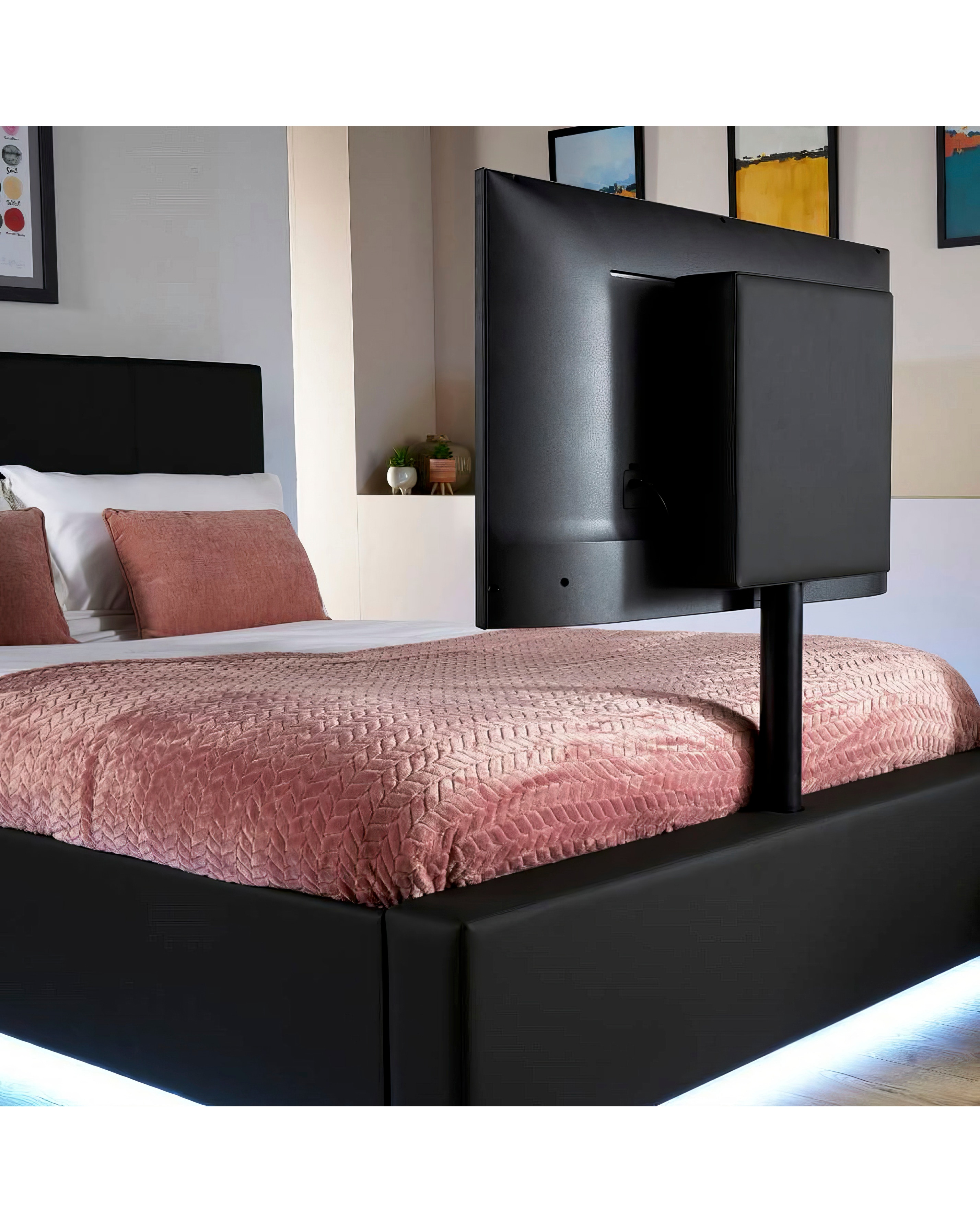 XR Living Ava Upholstered TV Bed with LED Lights features a unique totating TV mount allowsing you to watch TV from anywhere in the room. With built in LED strip lighting under the bed, multi-colour RGB light options allow you to customise the lighting using the remote control. featuring a cushioned, upholstered headboard for added comfort. Self assembly required