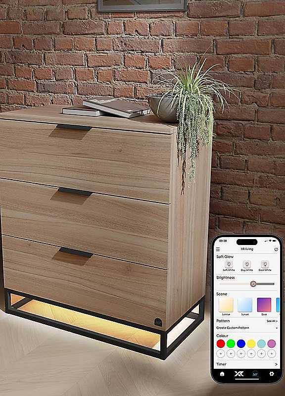 The Denver Chest of Drawers with under-glow lights presents a harmonious blend of natural and modern design, crafted with a contemporary oak wood grain finish that brings the warm and textured appearance of the outdoors into your home. The innovative integrated RGB LED lighting can be effortlessly controlled via the touch button or the Neo Motion app, providing a soft, customisable glow allows you to set the perfect ambience, whether you prefer a subtle, warm light to enhance the wood tones or a vibrant hue to create a dynamic focal point. With 3 smooth running drawers, the Denver provides plenty of space for all of your bedroom necessities. The sturdy black steel base frame offers a sleek, contemporary contrast. Max load limit: Top 20kg / Drawer 5kg. The lighting can be controlled through your mobile phone! Just download the Neo Motion app which is compatible with all XR Living products with Neo Motion Sync function. The app can control multiple Neo Motion Sync products at the same time. The innovative integrated RGB LED Lighting provides a soft, customisable glow underneath the piece, allowing you to set the perfect ambience to suit your space. Includes three tones of white light: Cool White: For a bright and energetic feel. Day White: Balanced light that mimics natural sunlight. Soft White: Soft and cosy lighting for a relaxing atmosphere. Finished with a light brown oak effect finish with tones inspired by nature for a relaxing and calming atmosphere. Complete with a solid black metal base to provide a timeless industrial look that compliments any environment. The Denver's 3 drawers provide plenty of space for all of your clothes, accessories and more, with easy to catch, subtle handles and smooth runners. Weight of Product: 29.5kg Weight Capacity: Top 20kg / Drawer 5kg Suggested Number of People for Assembly: 2 Tool Kit Included: Yes Self-Assembly Manufacturer's 1 year guarantee Product Care: Wipe clean only, avoid household cleaners/abrasives Specifications Material: Wood, Particle Board, Steel Dimensions approx. 76H x 80W x 40D cm