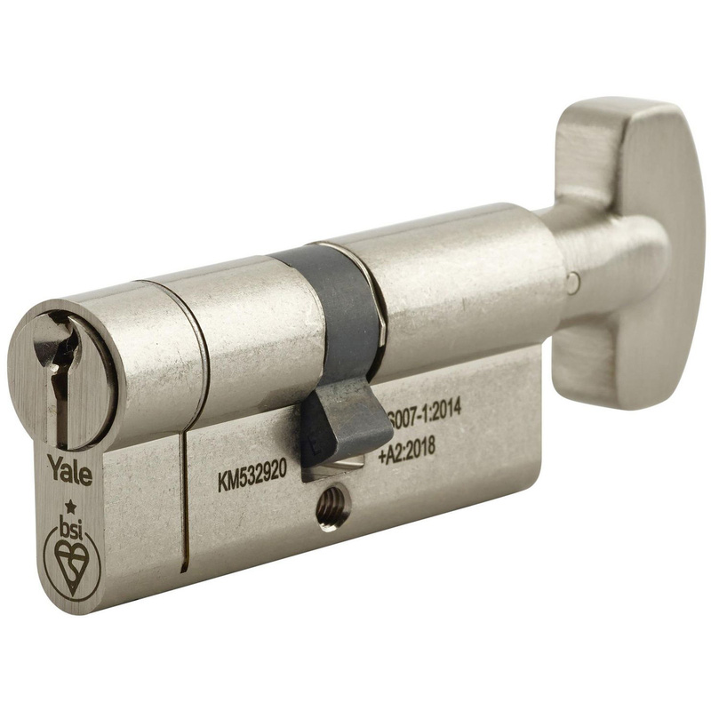 * 1 Star security – TS007:2024 rated and endorsed by the Police’s Secured by Design scheme * High protection – built-in anti-snap, anti-pick, anti-drill and anti-bump features * Sacrificial break-line – designed to defend against snap attacks * Patented key design – prevents unauthorised key cutting * Fire rated – suitable for FD30 and FD60 fire doors * 10-year guarantee – for peace of mind "The KM Series 1 Star Cylinder delivers high-performance security, designed and tested to Yale’s exacting standards. It offers defence from a range of known methods of attack and is accredited to the British kitemarked TS007-1:2024 1 star standard. This cylinder is suitable for PVCu, timber and composite doors. It includes 3 Yale-authenticated keys with a modern bow design for better grip. The patented key design means they can only be duplicated by authorised partners, keeping your home secure. This product can be combined with Yale 2 Star door furniture to represent a fully accredited TS007 3 Star solution. It is supplied with a 50mm retaining screw. * 1 Star security – TS007:2024 rated and endorsed by the Police’s Secured by Design scheme * High protection – built-in anti-snap, anti-pick, anti-drill and anti-bump features * Sacrificial break-line – designed to defend against snap attacks * Patented key design – prevents unauthorised key cutting * Fire rated – suitable for FD30 and FD60 fire doors * 10-year guarantee – for peace of mind * Multiple options available – choose from various sizes, finishes, and thumbturn models. | Yale 1 Star Euro Thumbturn Cylinder 40-40mm in Nickel