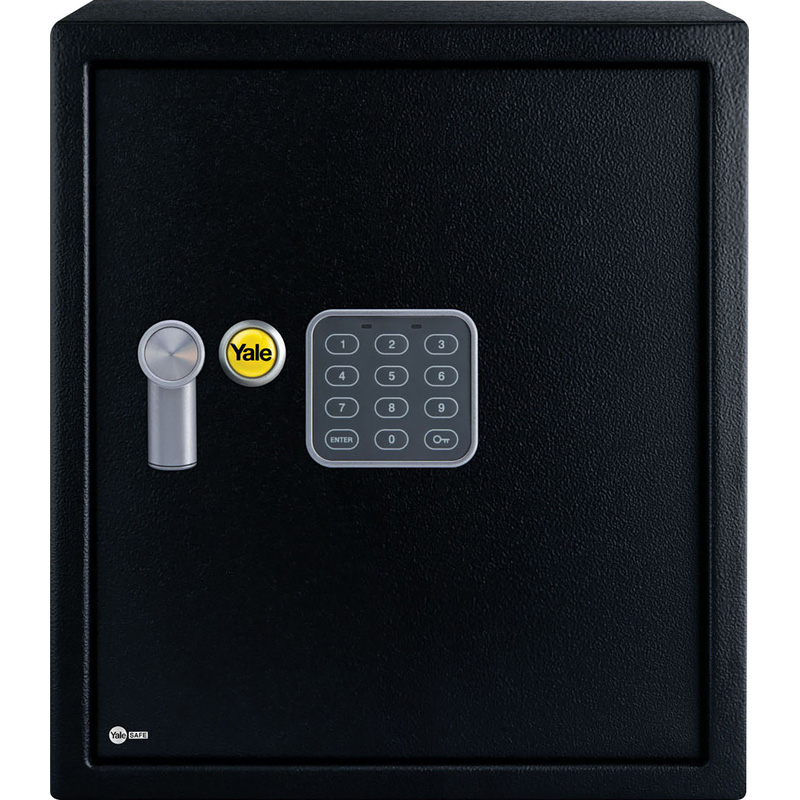 The Yale Value Safe protects sensitive information and your most valued personal possessions with its solid steel construction. The Safe uses digital keypad code entry with key backup, offering 10,000 possible combinations using a 3-8 digit programmable code. * Simple to operate - one-touch reset button inside the safe * Programmable digital keypad * Steel construction * Locking mechanism: Anti-bump solenoid * Locking bolts: Front x2 (16mm) * Mechanical over-ride: Radial Key * Installation: Must be securely mounted via fixings provided (ideally to floor or wall) * Two LED light indicators, green to open, red for error or low battery Exterior Dimensions (HWD): 390mm x 350mm x 360mm Interior Dimensions (HWD): 380mm x 340mm x 310mm Wall Thickness: 1.5mm Door Thickness: 4mm Security Rating: Standard | Yale Value Safe Large 40L Large (40L) in Black | Steel