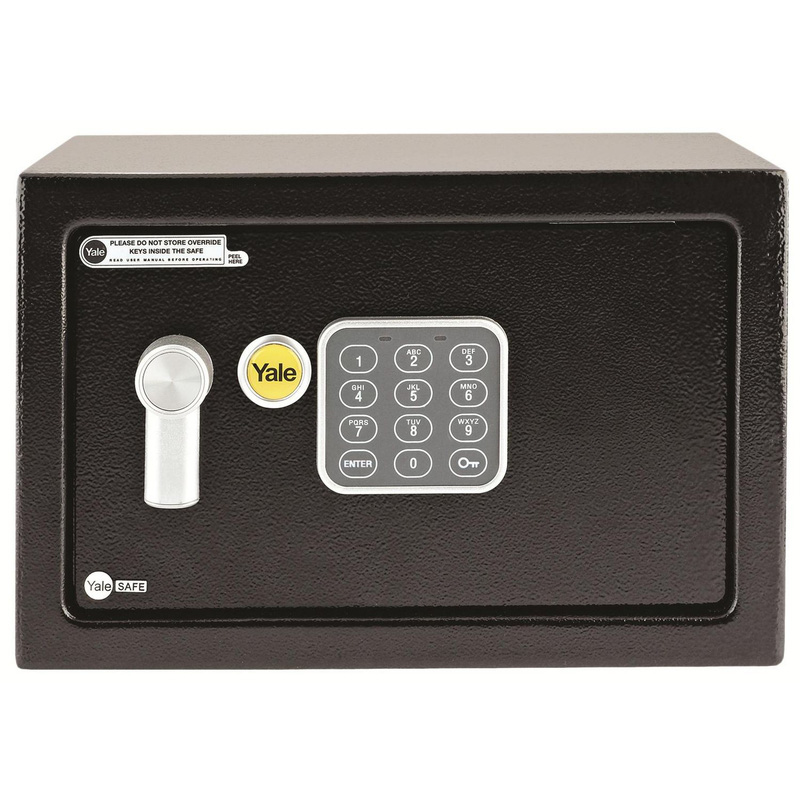 With this Yale Value safe, you’re guaranteed a reliable level of security for smaller essentials such as keys, passports, birth certificates, cards and cash – perfect for home, guest house or Airbnb use. You can easily set a 3-8 digit code to include both numbers and letters. This electronic lock offers 100,000+ combinations with an auto-lockdown function – the keypad locks for 20 seconds after three incorrect PIN entries, and then for 5 minutes after another three incorrect attempts. Lockdowns can be stopped by using a key to open the safe. Two keys are included along with AA batteries and fixing bolts for securing the safe to the wall or floor – you’ll be sure of complete peace of mind with a Yale safe. * Small safe – ideal for keys, passport, cash or cards * Easy keypad access – set your own unique pin code * 100,000+ combinations – choose a pin from 3-8 digits * 16mm locking bolts – for a safe locking mechanism * Anti-bump solenoid – prevents bump opening * Status indicators – LED ‘open’ and ‘low battery’ alerts * Auto lockdown – after three incorrect PIN entries * Two keys – for forgotten PIN codes or battery changes DIMENSIONS * Exterior – 200(H) x 310(W) x 200(D)mm * Interior – 190(H) x 300(W) x 150(D)mm * Door thickness – 4mm * Wall thickness – 1.5mm * Volume – 8.6L WHAT’S INCLUDED * 1x Yale small safe * 2x mechanical override keys * 4x AA batteries * 1x fixing bolts pack * 1x user manual | Yale Value Safe Small 8L Small 8L in Black