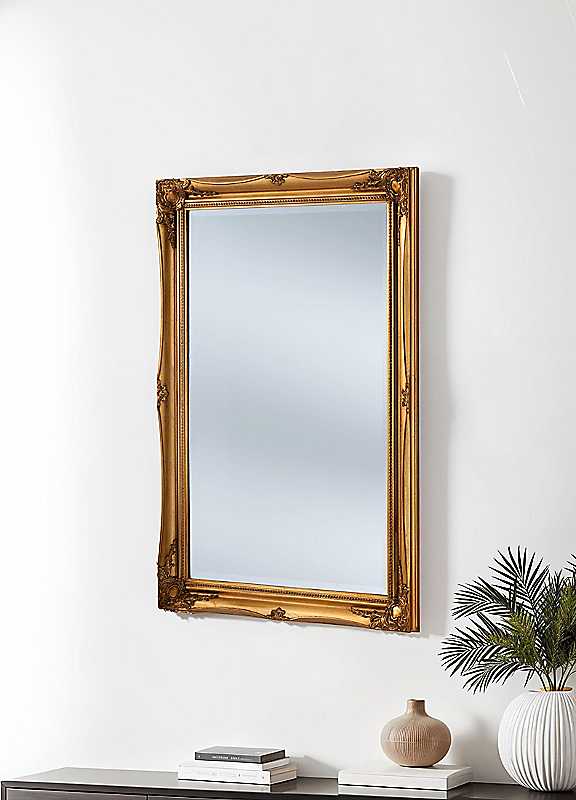 This beautifully simple French style gold wall mirror has detailing in all four corners and beading around the inside edge and is made of solid wood with a plaster detailing, which is then painted. This stunning gold mirror is equally at home in an entrance hall, a bedroom or a dining room, above a piece of furniture or on its own. This wonderful gold mirror is beautiful in its simplicity.Size approx. 65 x 90 cm | long wooden mirror, mirror wall decor, long wall mirror