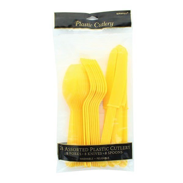 This pack of 6 yellow plastic cutlery set includes a knife, fork and spoon for use with party food.