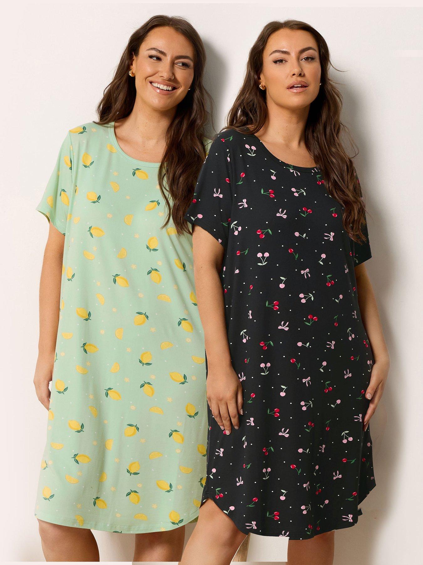 Yours Curve 2 Pack Soft Touch Fruit Dipped Back Nightdress Size & Fit True To Size - Order Your Usual Size Relaxed Fit Knee Length Available In Sizes 14 - 40 Details Curve 2 Pack Soft Touch Fruit Dipped Back Nightdress By Yours Black 2 X Multipack Short Sleeves Round Neck Ditsy Fruit Print Pull On Fastening Material & Care Material Content: 95% Polyester 5% Elastane Washing Instructions: Machine Washable
