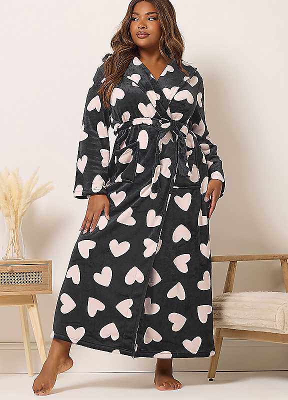 Yours Curve Love Heart Maxi Dressing Gown - Black - Size 30/32