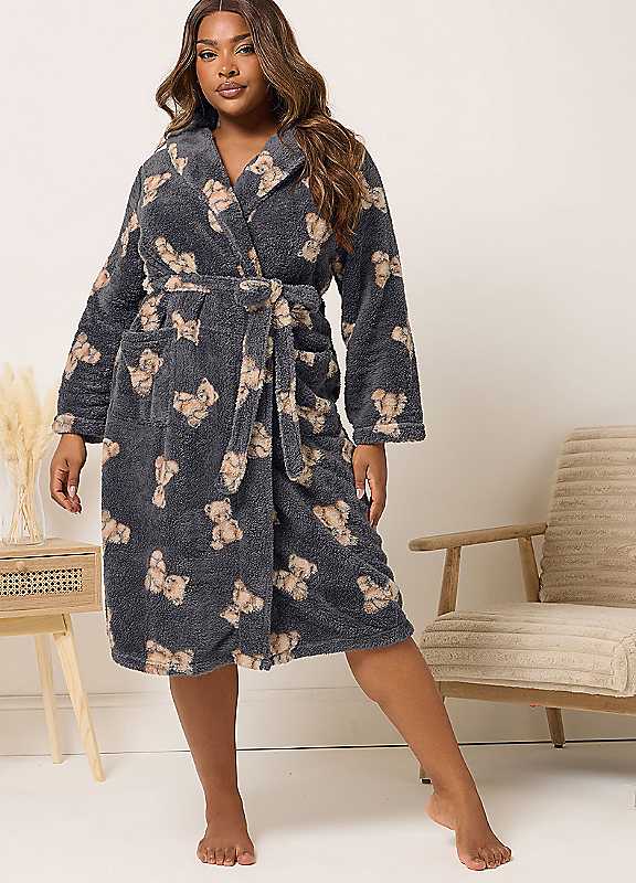 Yours Curve Teddy Shawl Collar Dressing Gown - Grey - Size 30/32