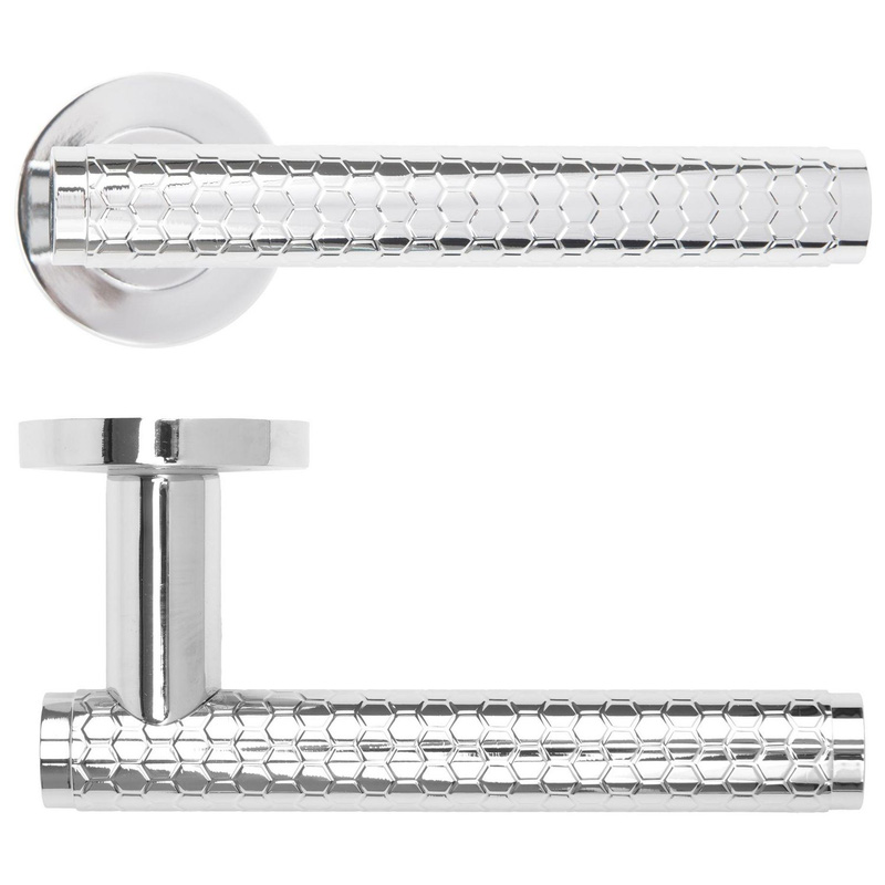 An elegantly patterned lever that adds a touch of style to any room – the Favo door handle is suitable for installation on 35-54mm doors without the need for break-off screws. Perfect for domestic use, this lever on rose door handle combines a robust and durable zinc construction with an attractive polished chrome finish to blend in with almost any home interior. Comes with fixings included for a quick and easy installation. * Lever on rose door handle – for 35-54mm doors * 140mm door lever – with a projection of 67mm * 50 x 8mm round sprung rose – screw-on rose cover * Full zinc construction – solid and long-lasting * Patterned lever – for a textured look and feel * Polished chrome finish – suits almost any interior * Improved Allen key – for easier installation * Secure fit – grub screw on underside of lever * Fixings included – wood screws and bolt through fixings | Zoo Hardware Favo Lever on Rose Door Handle Polished (Pair) in Chrome