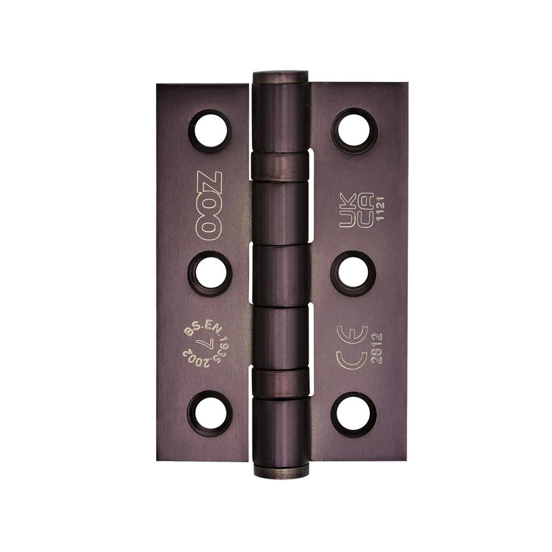 A square corner door hinge made from a strong stainless steel in an attractive bronze finish. Successfully fire tested in accordance with the requirements of BS EN 1634-1, suitable for use on timber fire doors up to 30 minutes. * Grade 7 ball bearing hinge – 76 x 50 x 2mm * Square corners – quick and easy replacement * Grade 201 stainless steel – inline drilled * Etna bronze finish – for a sleek and stylish look * Fire-rated – for use on 30min timber fire doors * Fire testing – in accordance with BS EN 1634-1 * Performance testing – to BS EN1935:2002 | Zoo Hardware Grade 7 Ball Bearing Door Hinge Etna in Bronze | Steel